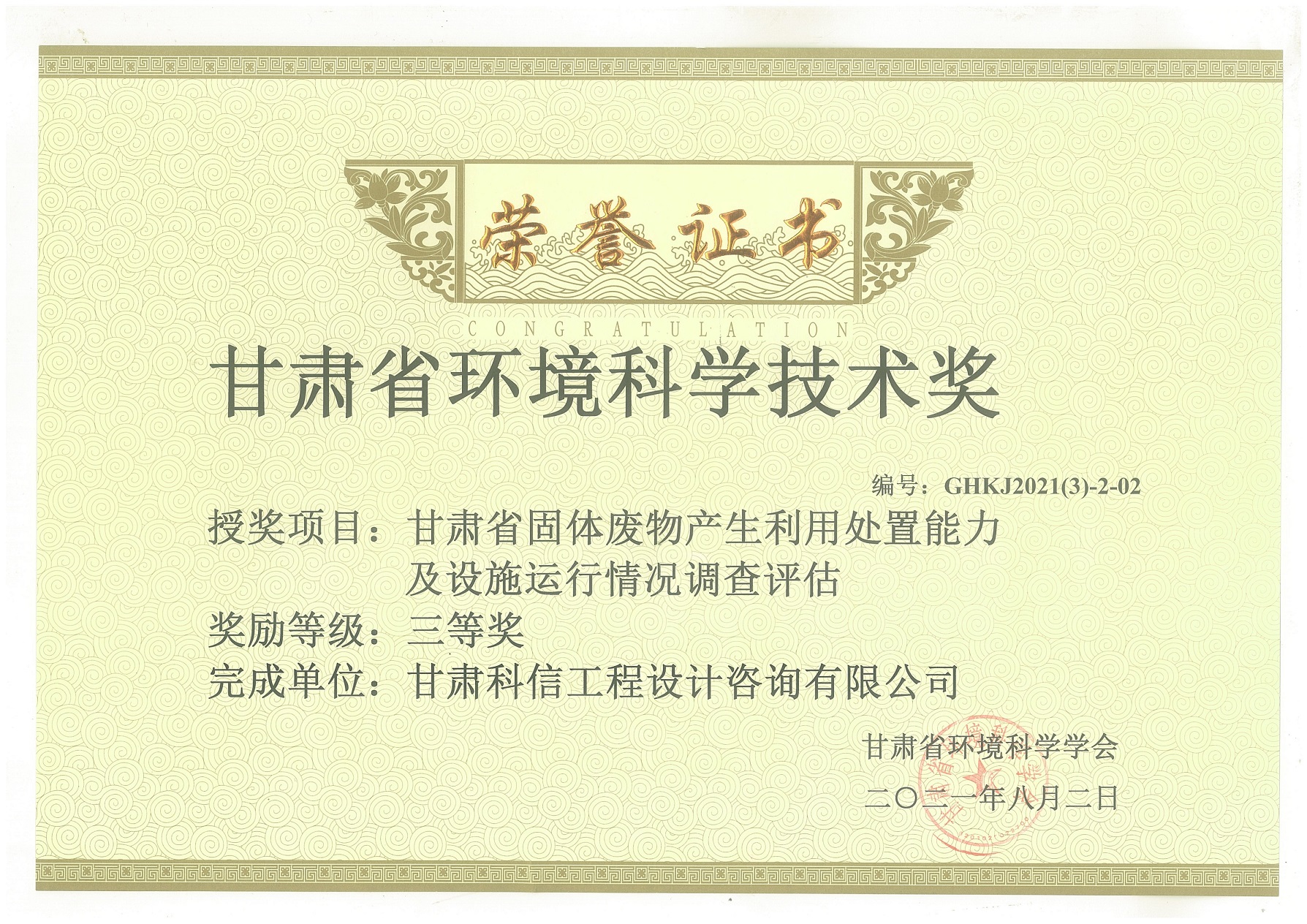 熱烈祝賀甘肅科信工程設計咨詢有限公司在2022年度甘肅省科技進步獎評選中,以“甘肅危險廢物動態監控方法體系建設與應用”項目,榮獲甘肅省科技進步三...